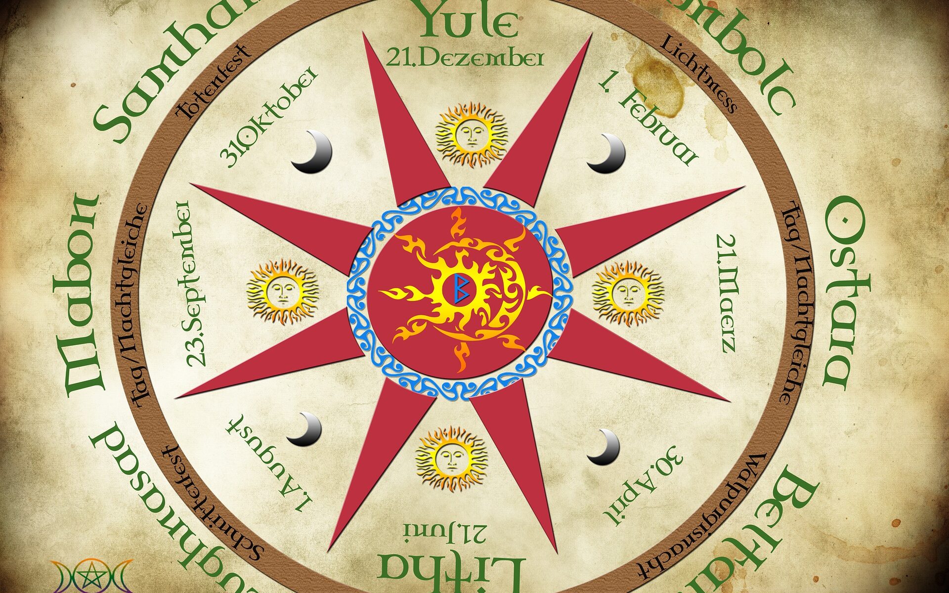 In the Gardnerian Book of Shadows it states that during the ritual of the spring equinox “The symbol of the wheel should be placed on the altar upright, decked with flowers, flanked with burning candles” . This suggests a link with the solstice fire festivals, where the burning of a wheel that was set in motion down a hill-side was common place.